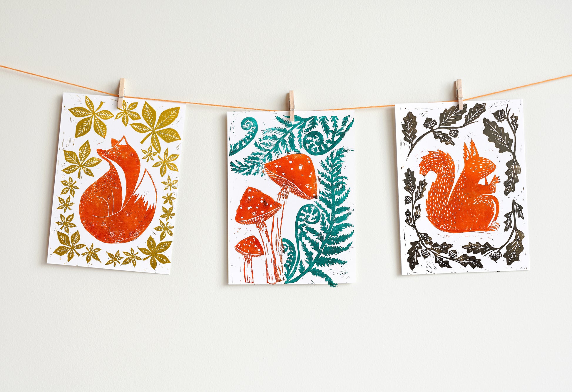 Autumn Feels- Lino Printing A5 Art Kit - Squirrel, Mushroom & Fox