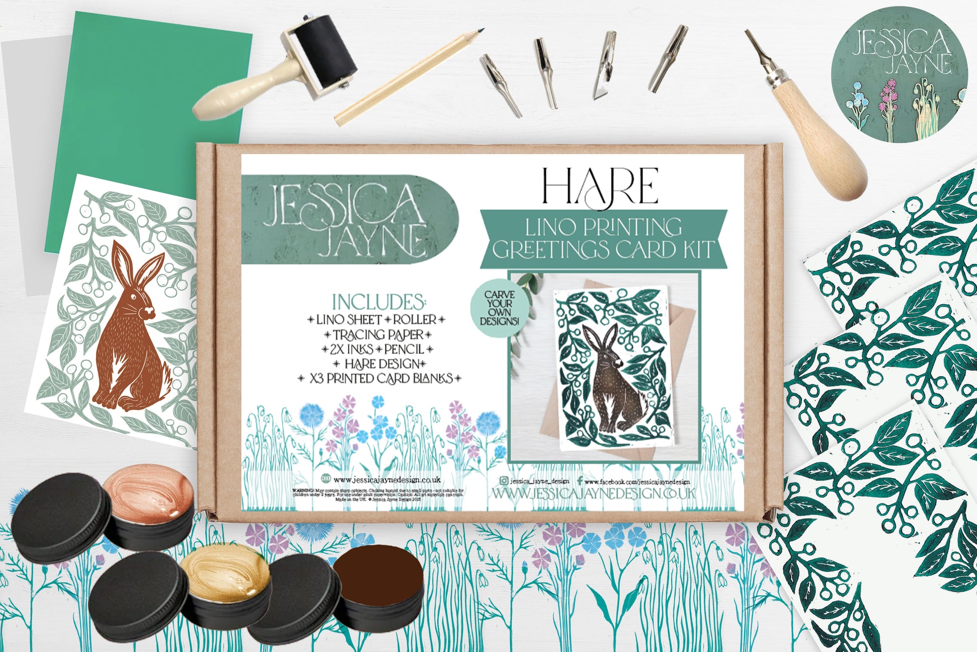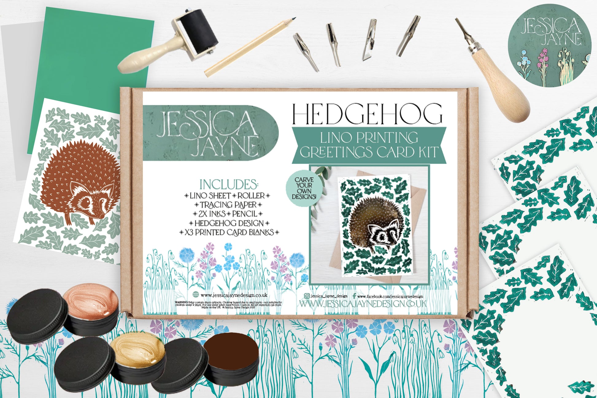 Comes with, Template (chosen animal) Design, Carving Tool, A6 Lino, Tracing Paper, Pencil, 3.5cm roller & Block Printing Ink in brown, Bronze & Gold 15ml Pots, x3 Pre Printed Card Blanks to co-ordinate with chosen design.